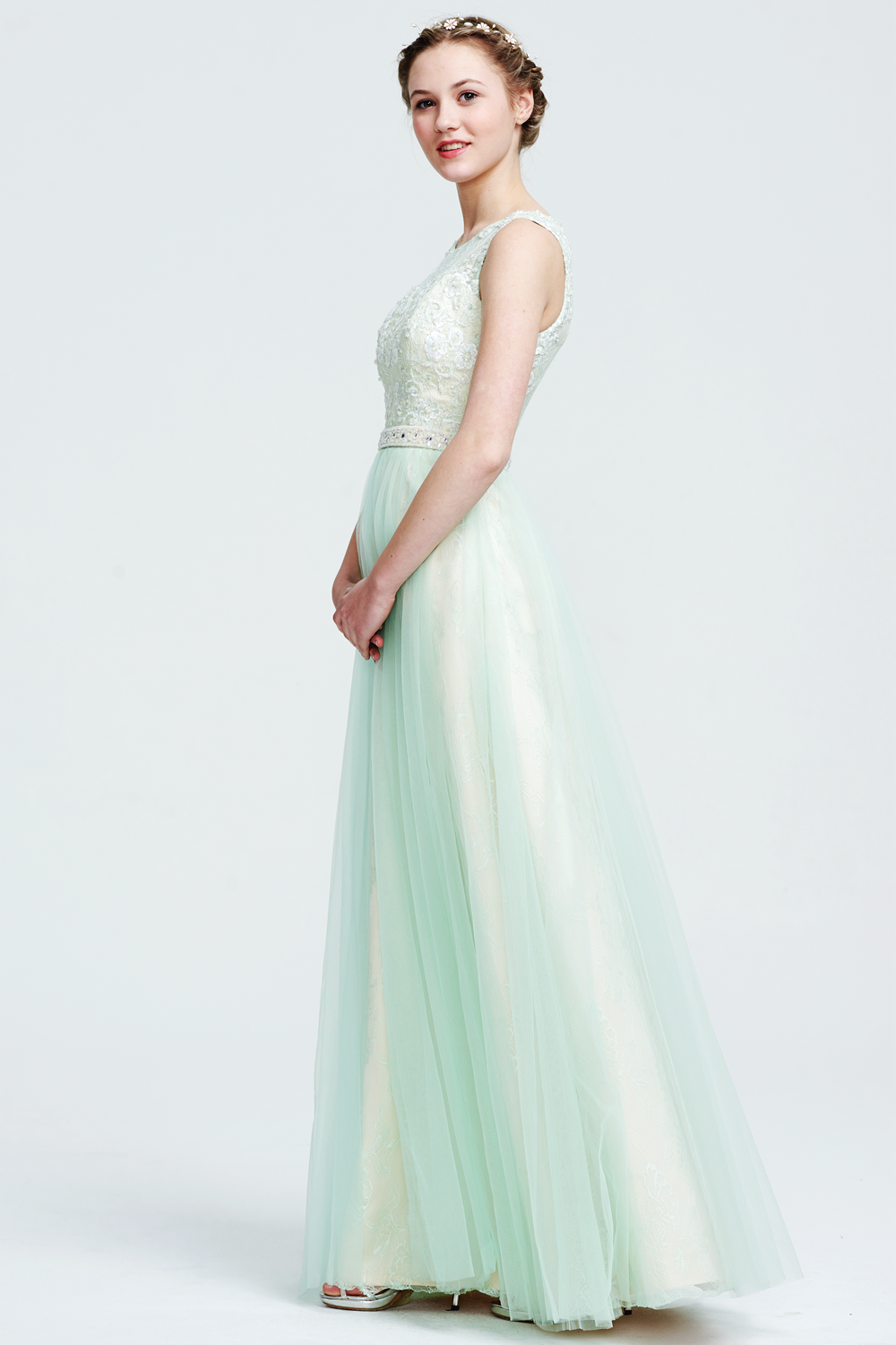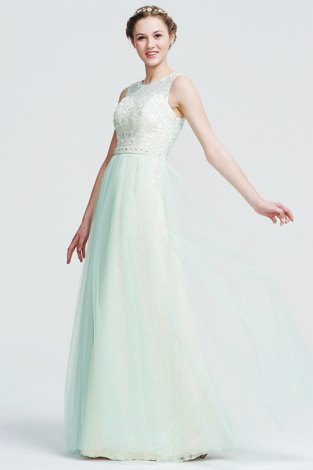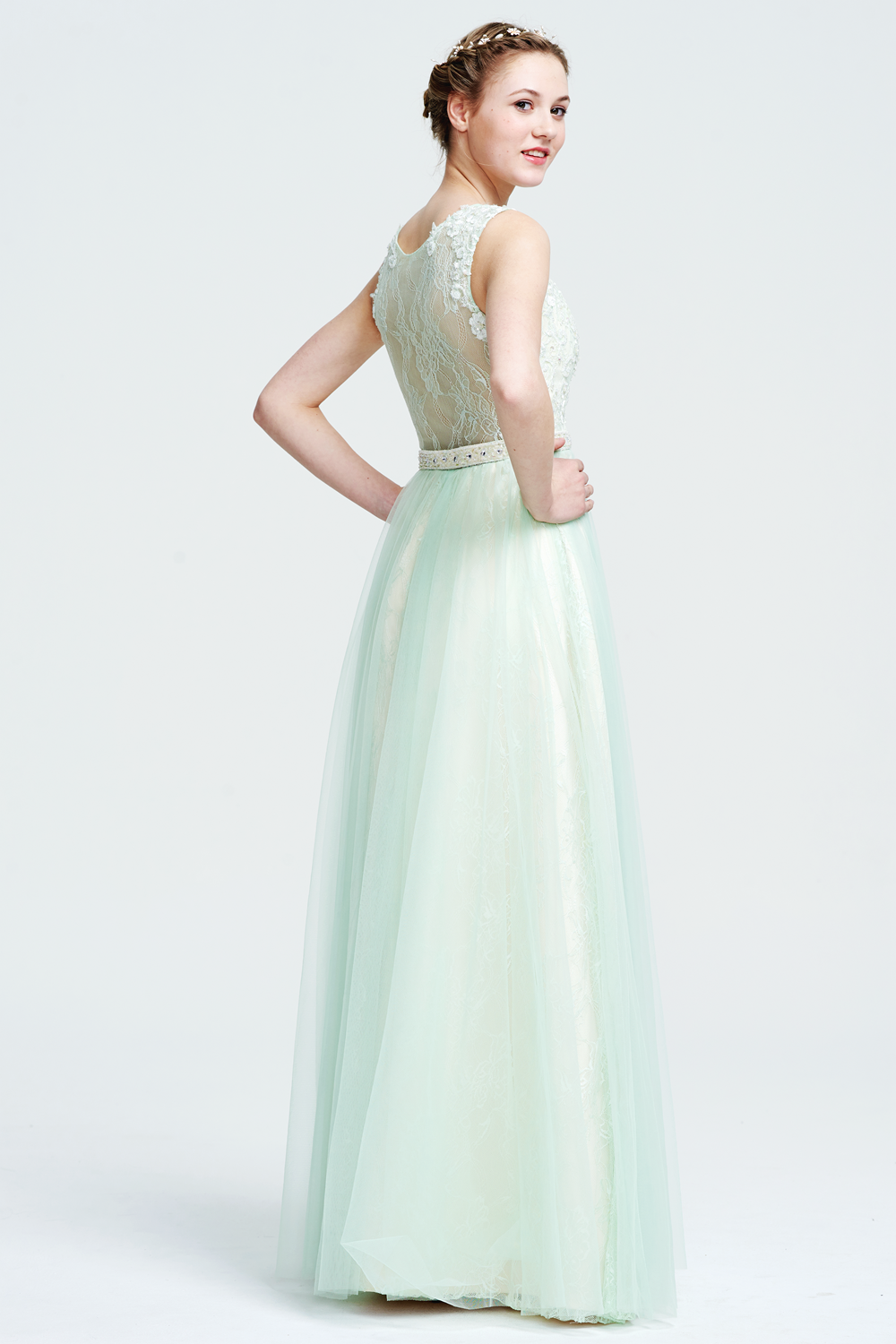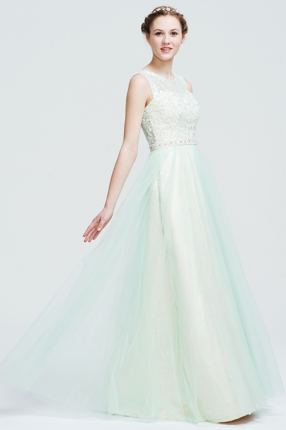 This gown features a sheer lace bodice, beaded waistband, and a flowing tulle skirt. The illusion back with lace embroidery creates an elegant and ethereal silhouette.