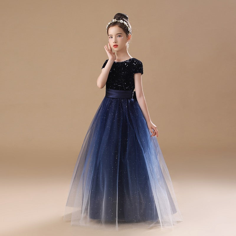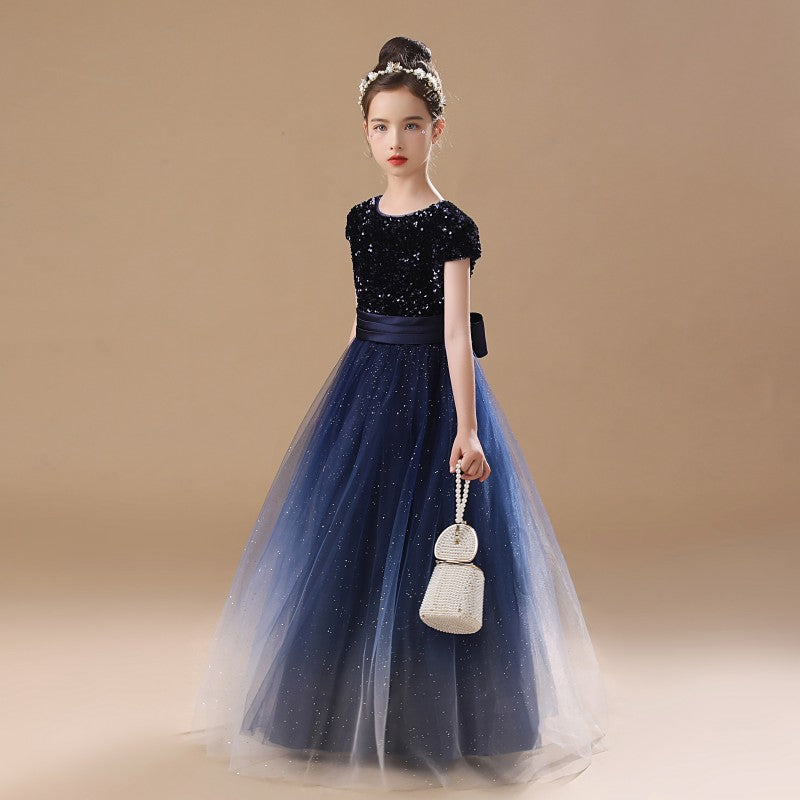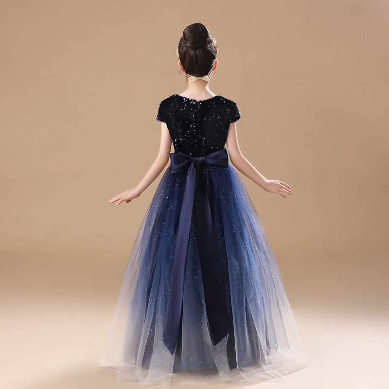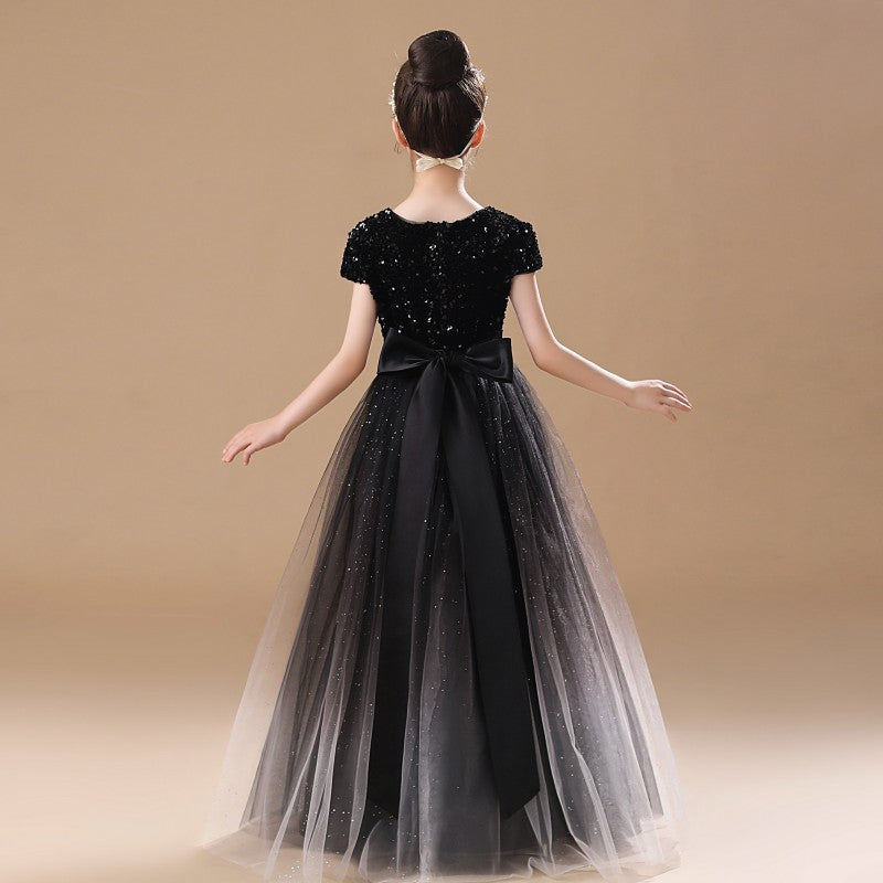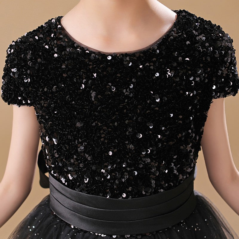 This black children's gown has a sequined bodice, gradient tulle skirt, short sleeves, and a bow detail at the back. It's suitable for formal events like pageants or galas.