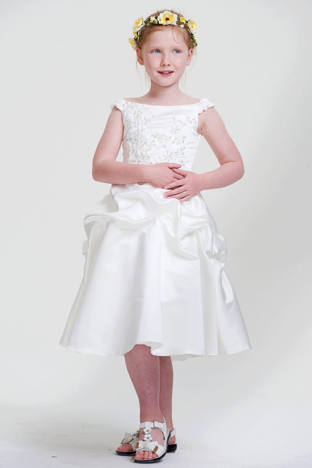 This white children's gown has a satin bodice, full satin skirt, off - shoulder sleeves, and a corset - style back. Suitable for formal events like weddings.