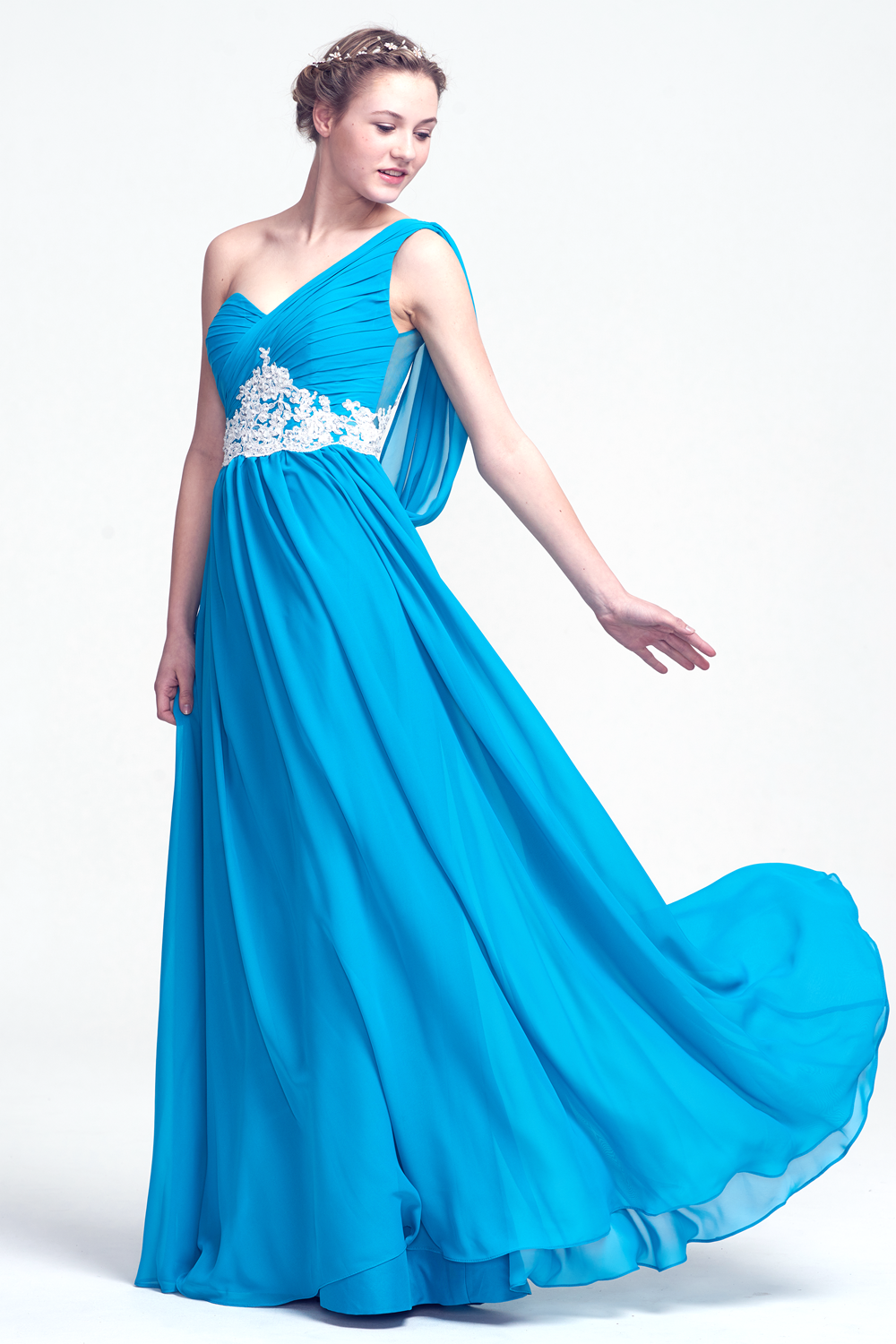 This gown features an asymmetric one - shoulder neckline, white lace embellishments at the waist, and a flowing chiffon skirt. The draped one - shoulder strap and illusion back detail create an elegant and sophisticated silhouette.