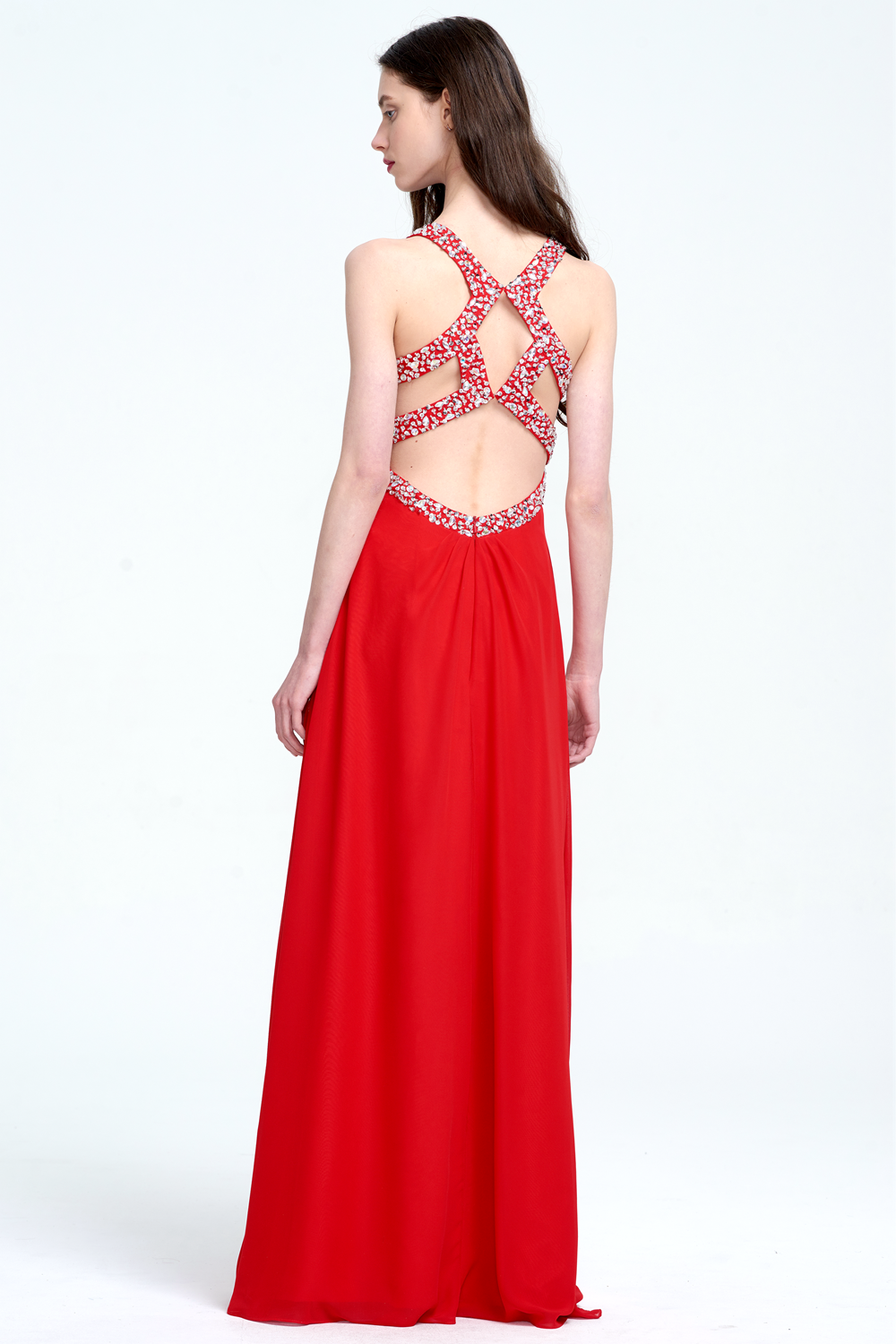 This red gown features a sweetheart neckline, beaded straps, and a flowing chiffon skirt. The open back with crisscross beaded straps creates an elegant and glamorous silhouette.