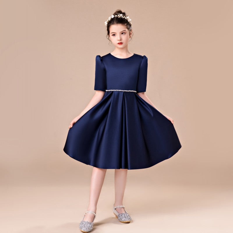 This dark navy children's dress has a round neckline, short sleeves, and a pearl belt. It's suitable for semi - formal events like parties or ceremonies.