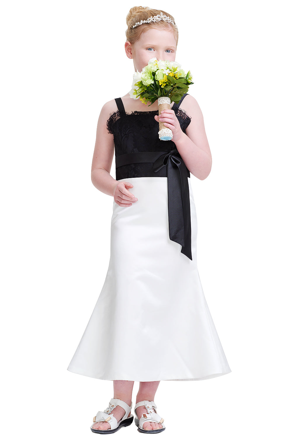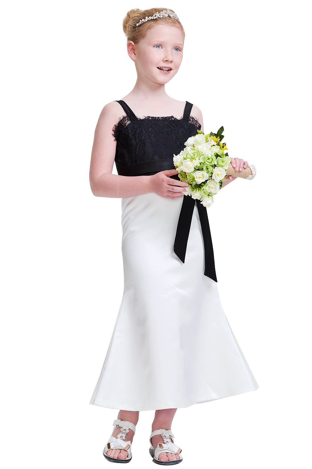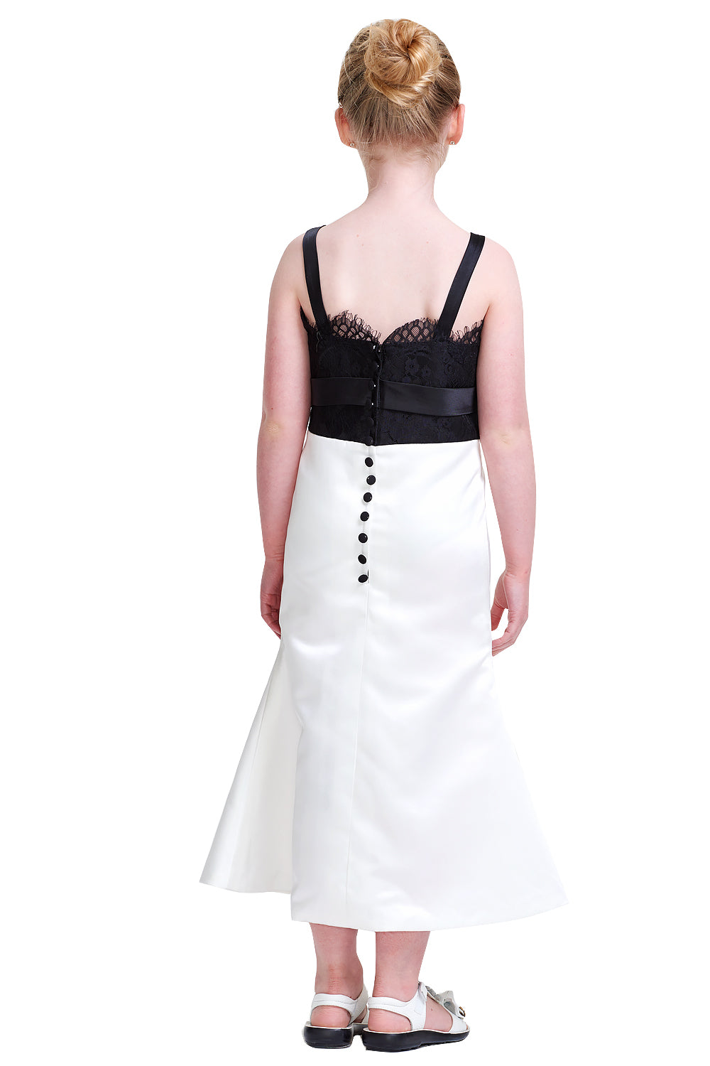 This children's dress features a black lace bodice, white satin skirt, bow detail, and button - down back. It's suitable for formal events like galas or ceremonies.