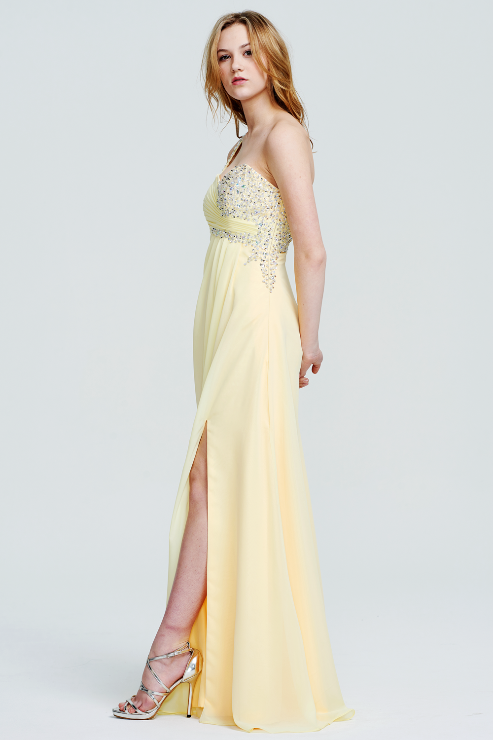 This gown features an asymmetrical neckline with one beaded strap and a cut-out detail at the waist. The flowing chiffon skirt creates an elegant silhouette, while the beading on the bodice adds sparkle.