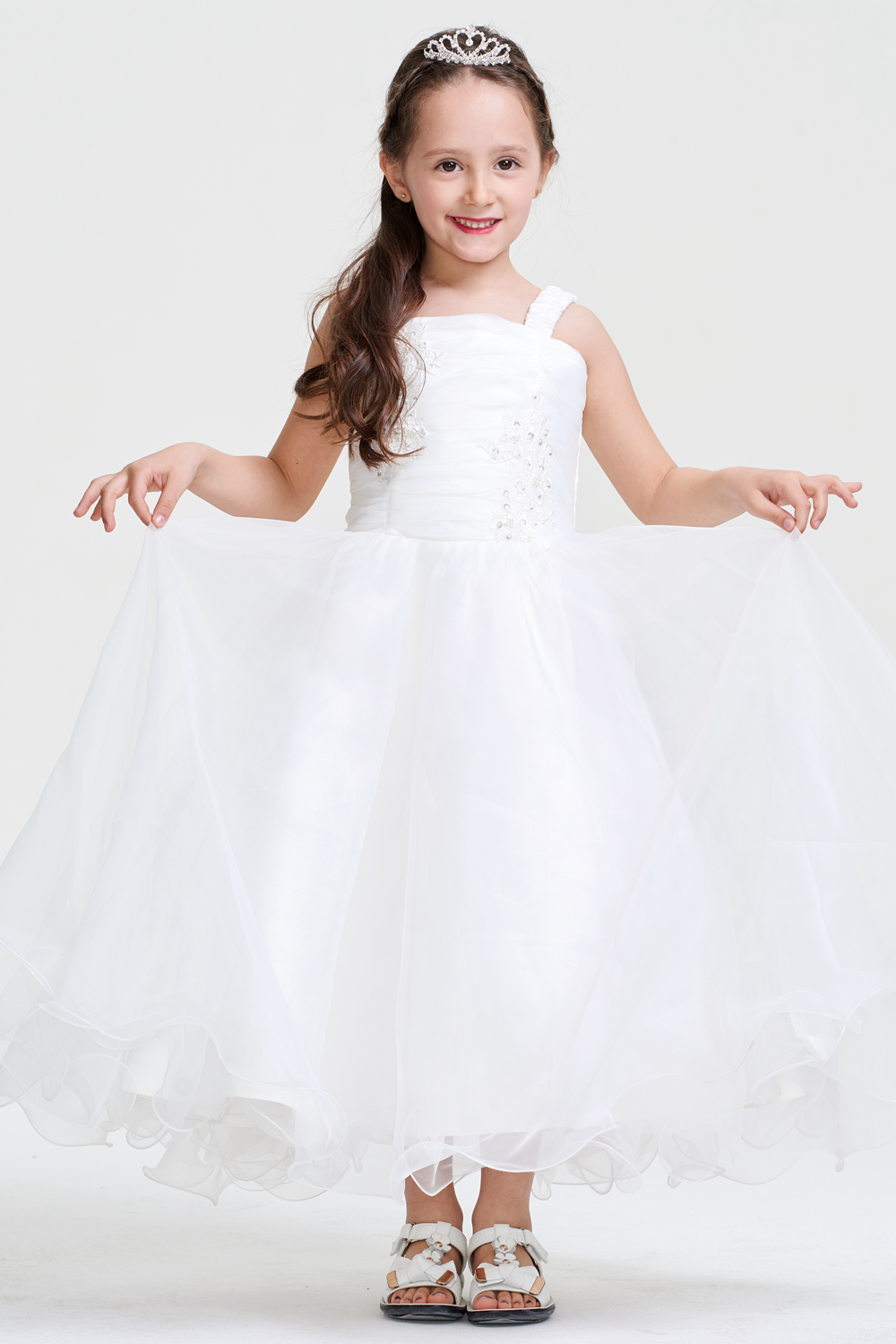This white children's gown has a satin bodice, organza skirt, delicate embroidery, and a corset - style back. It's suitable for formal events like weddings or pageants.