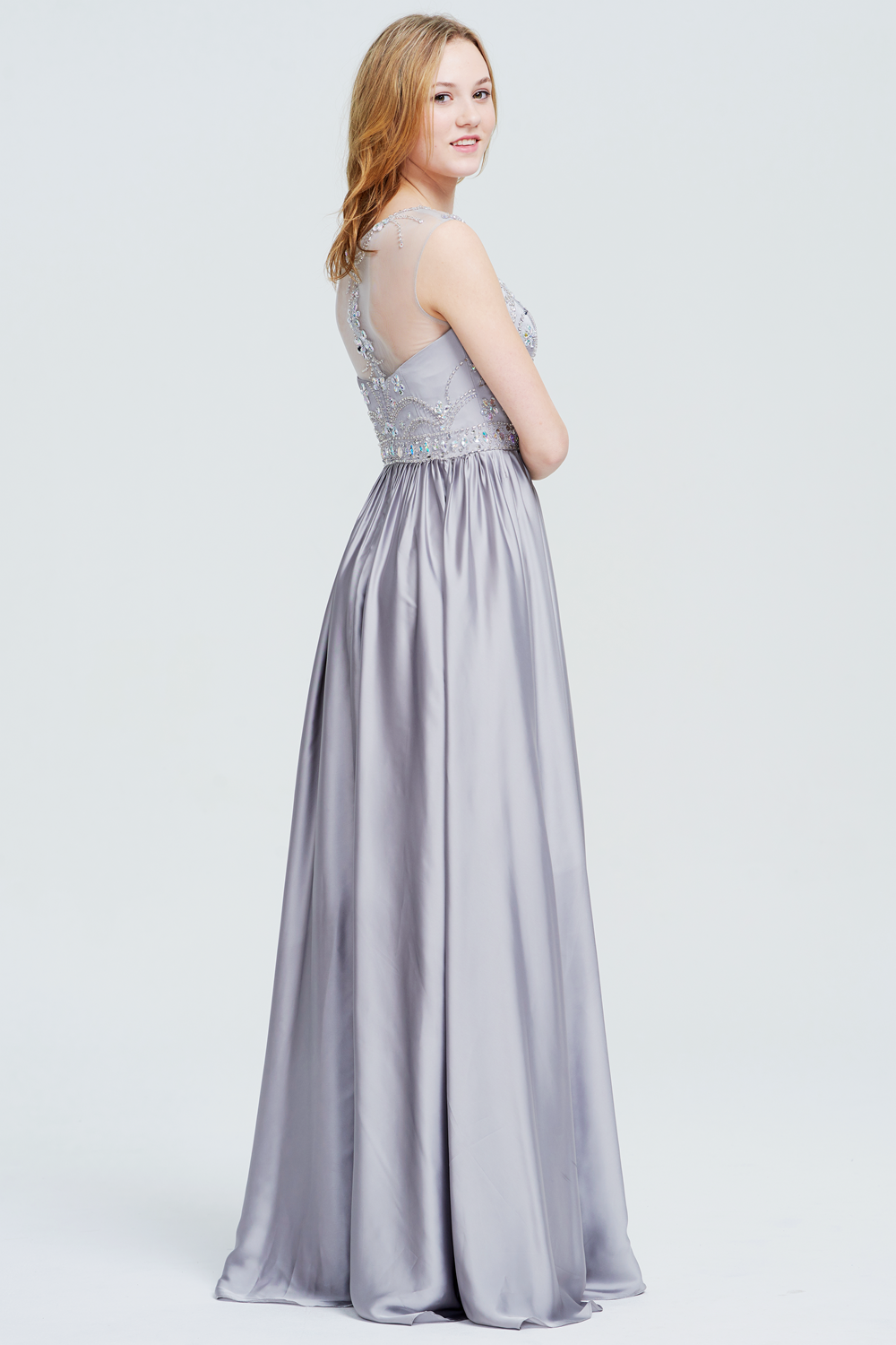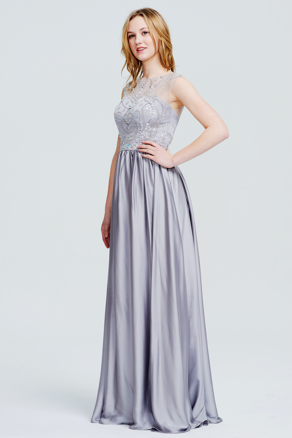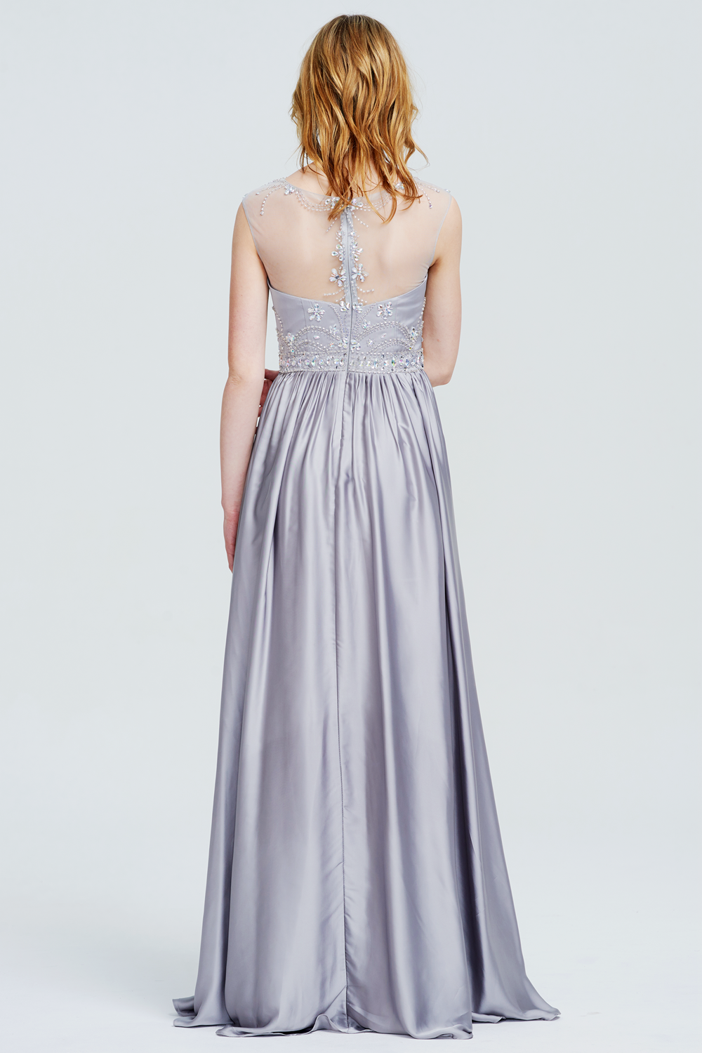 This gown features a sheer, beaded bodice with illusion sleeves and a flowing satin skirt. The open back with beaded appliques and a zipper closure creates an elegant and glamorous silhouette.