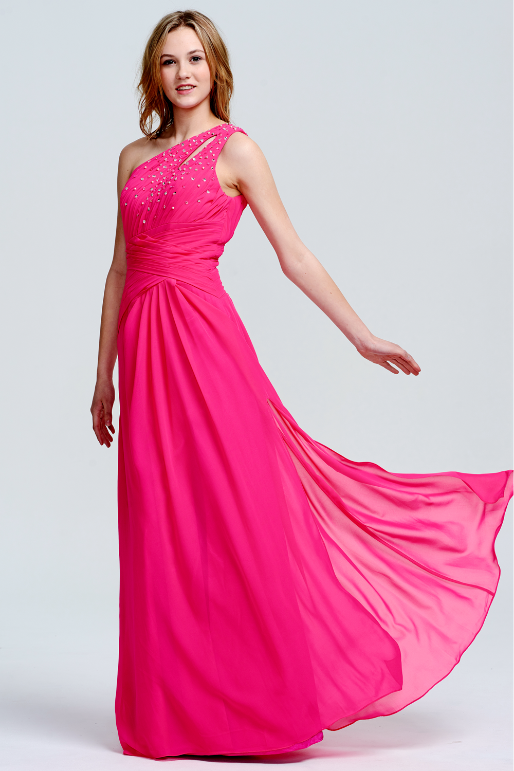 Fuchsia One-Shoulder Beaded Chiffon Prom Gown with Slit