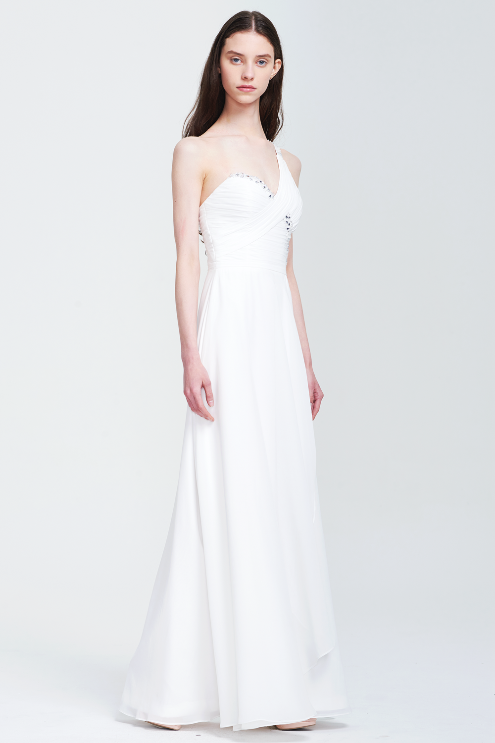 This white gown features an asymmetric one - shoulder neckline, beaded embellishments, and a flowing chiffon skirt. The open back with crisscross straps and beading creates an elegant and glamorous silhouette.
