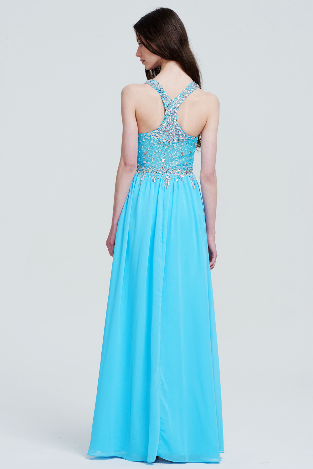 This gown features a beaded, V-neck bodice with a crisscross back design. The flowing chiffon skirt and intricate beadwork create an elegant and glamorous silhouette.