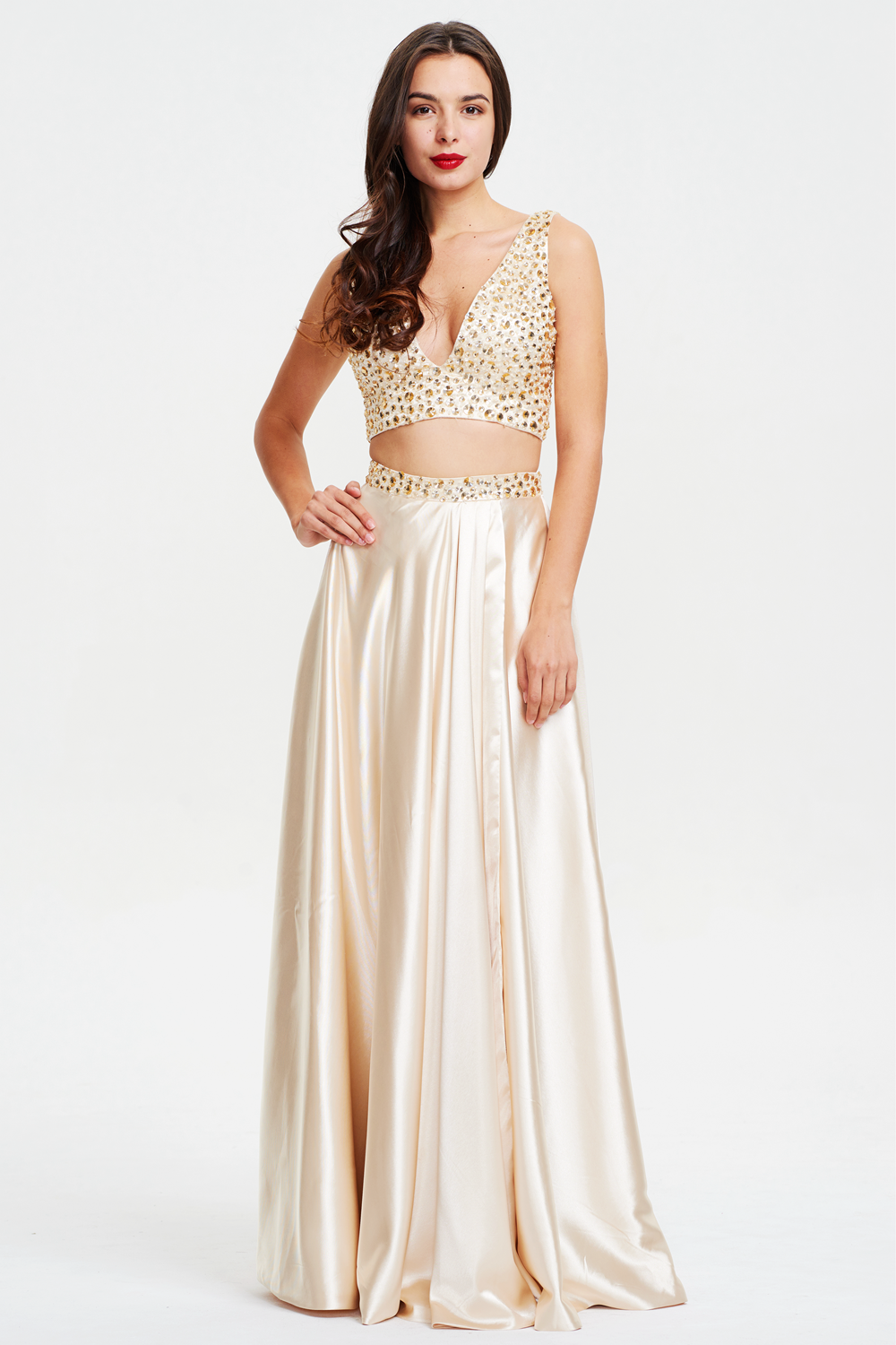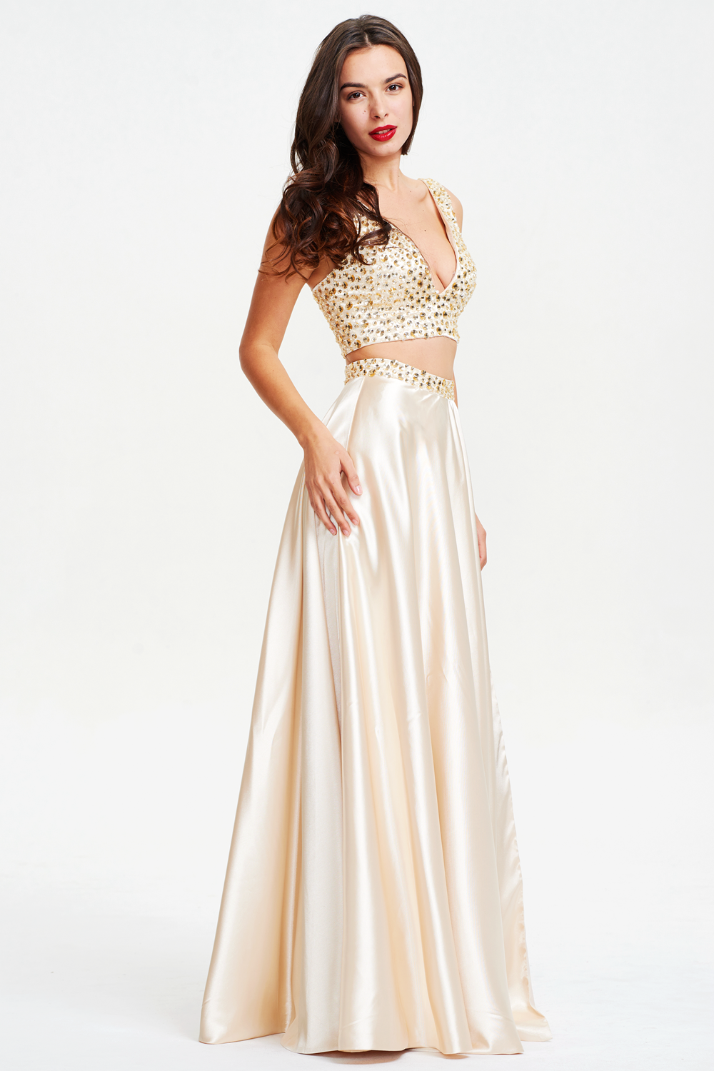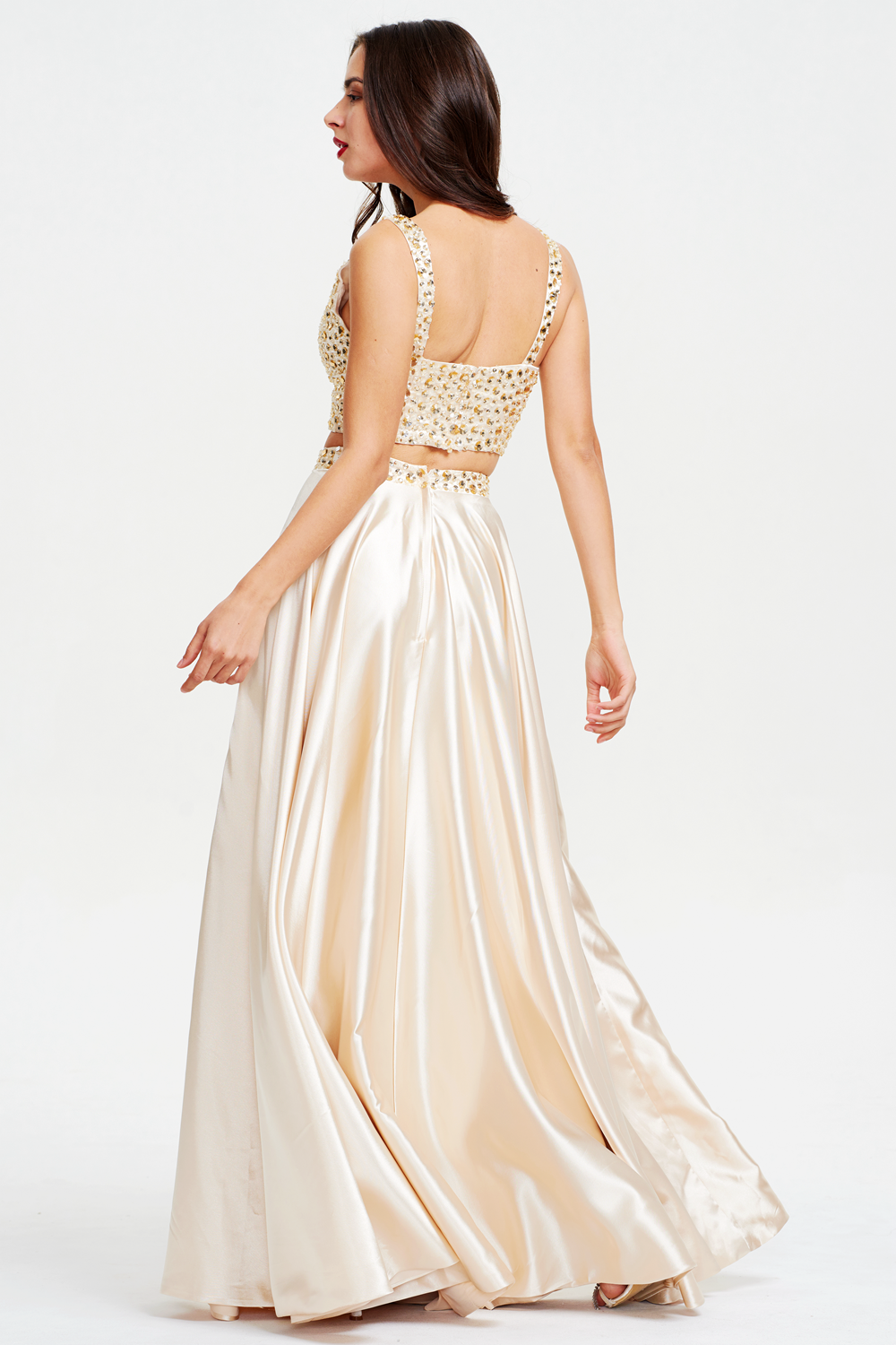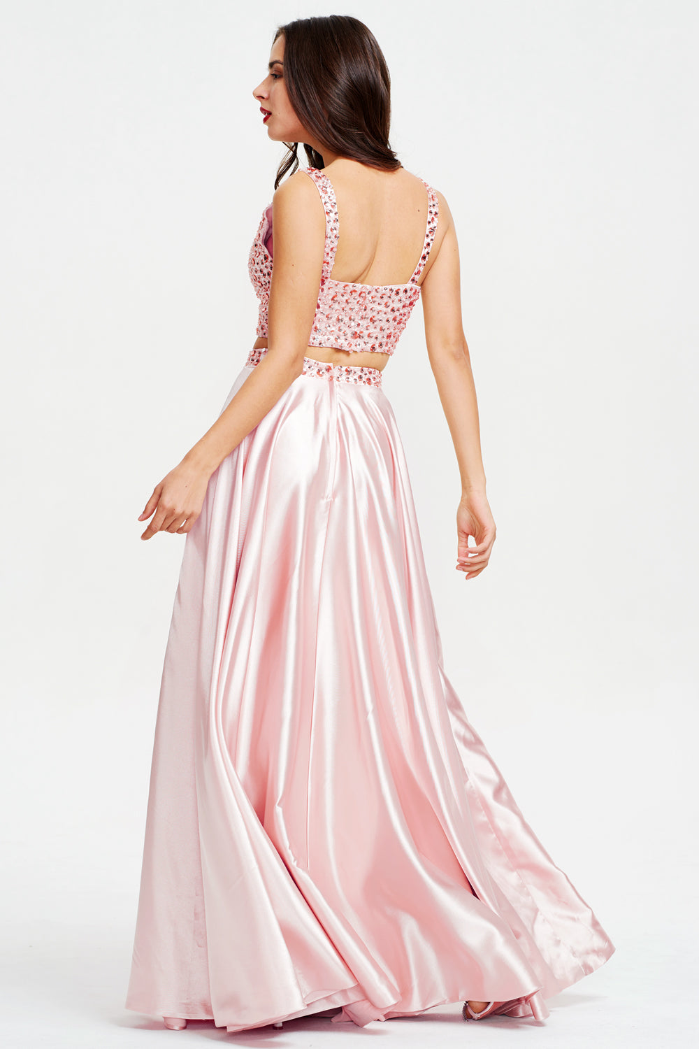 A-Line V-Neck Sleeveless Two Piece Slit Satin Long Prom Dresses